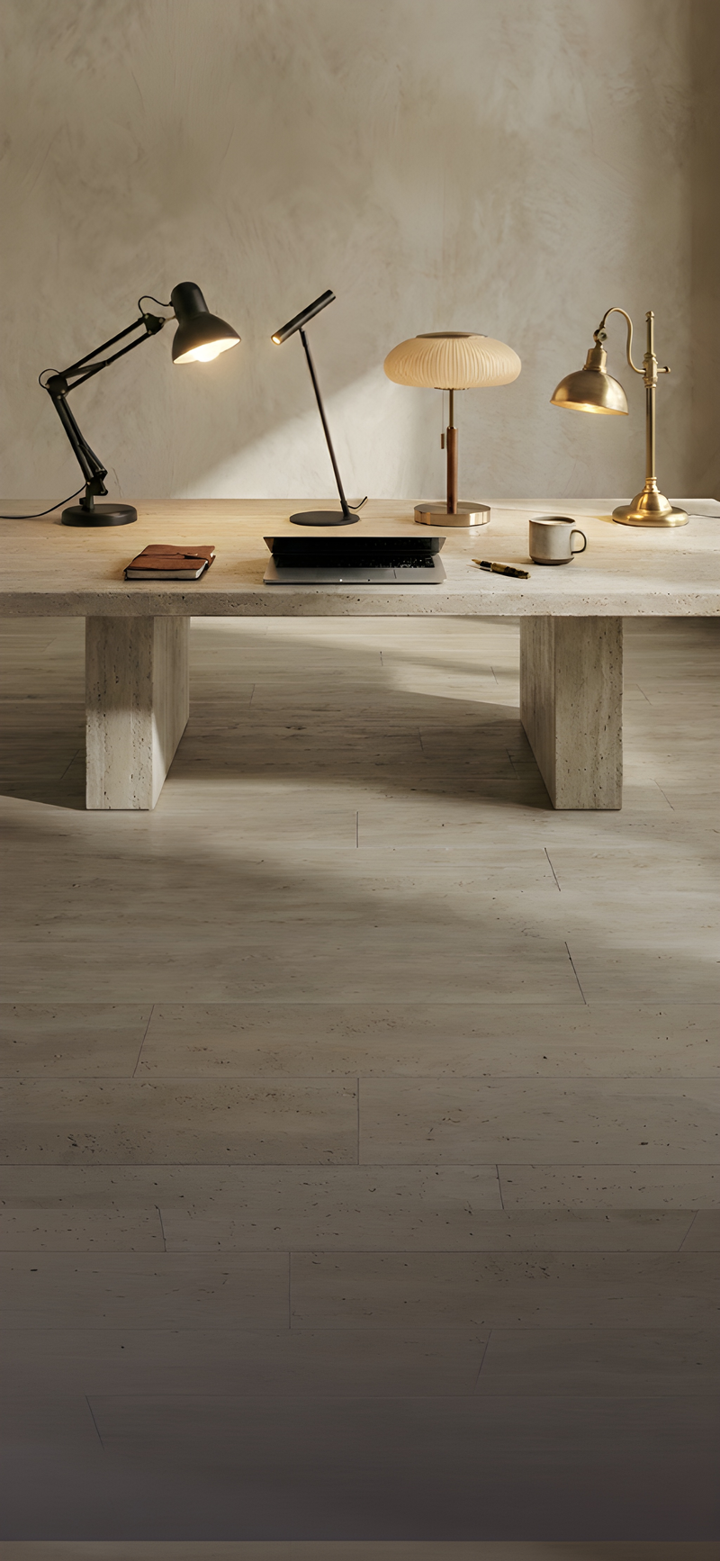 Dans un monde qui s’accélère, Lamperia propose une lumière de bureau qui apaise et révèle, où chaque geste retrouve son importance. La collection s’articule comme un dialogue entre les époques et les matières.